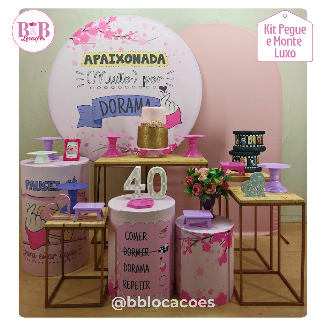 Bandejas e boleiras (peças em acrílico) e também acompanha 1 bolo fake e 1 tapete.