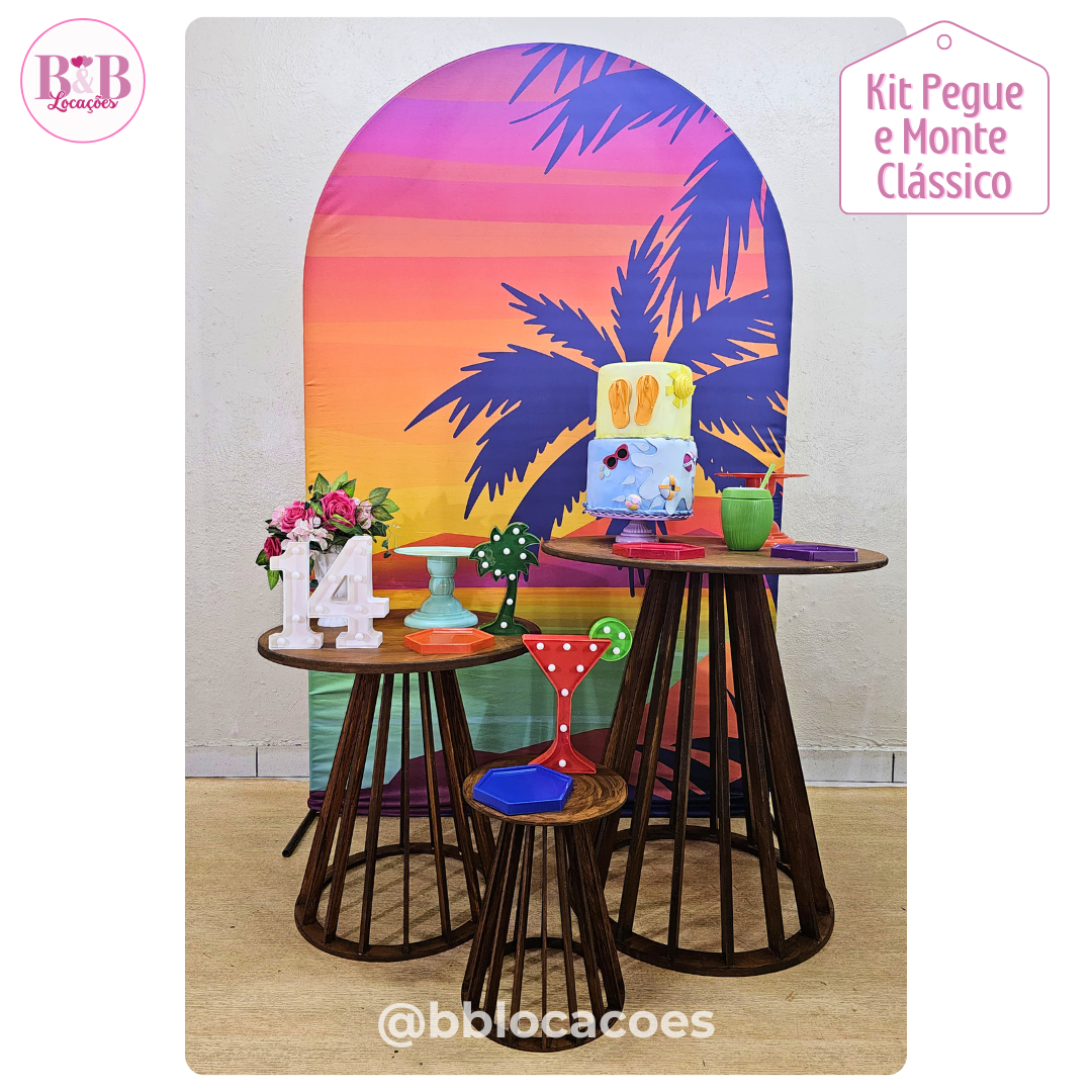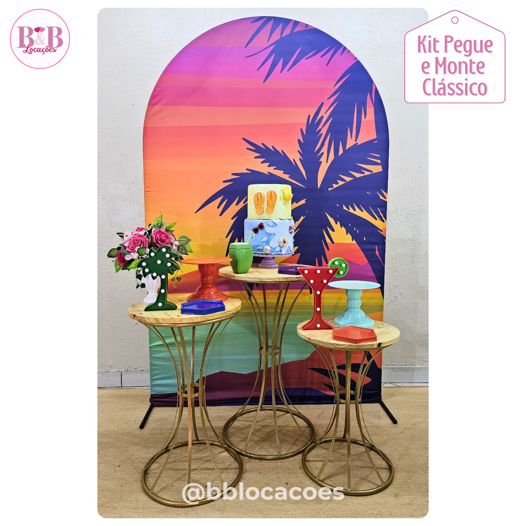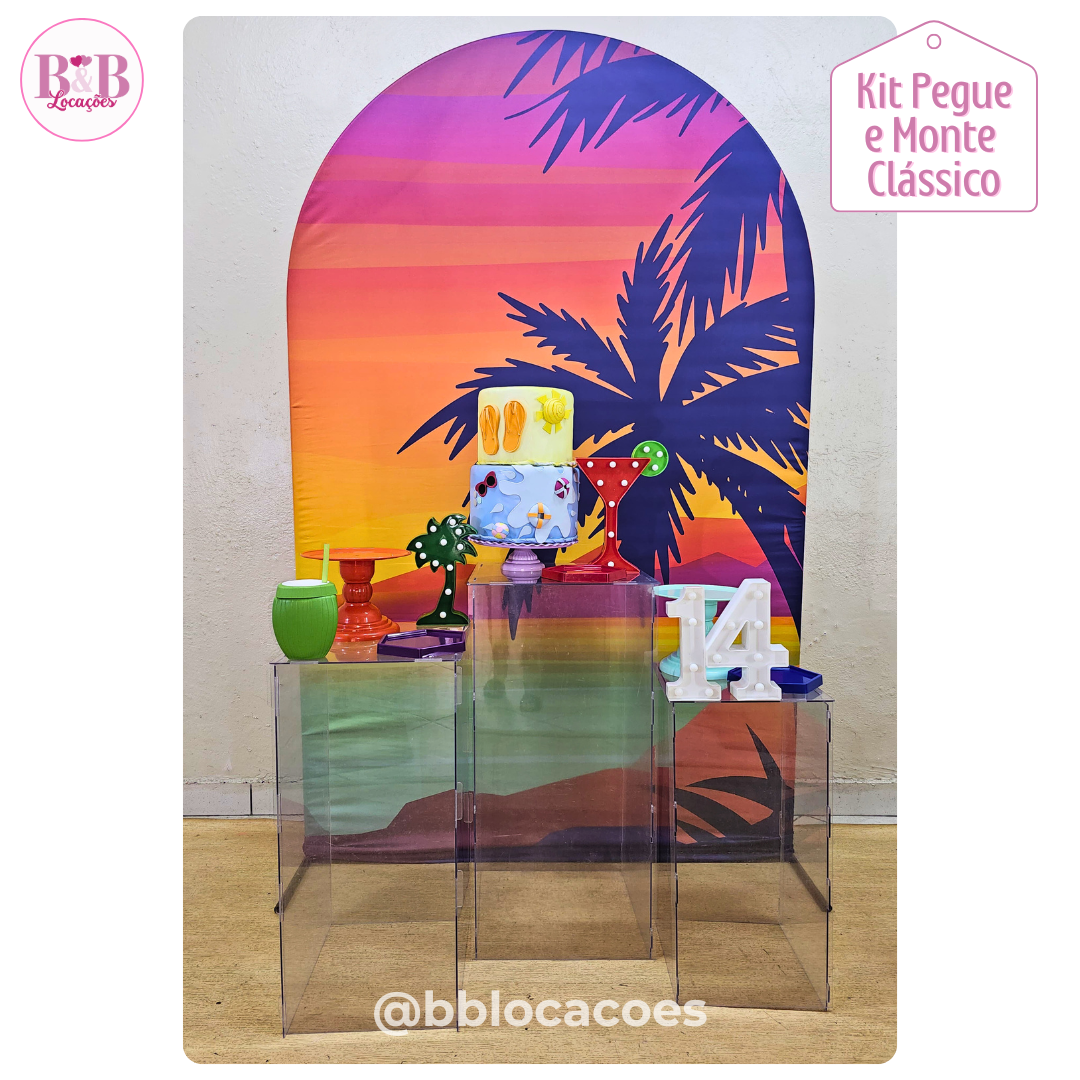 Bandejas e boleiras (peças em acrílico) e também acompanha 1 bolo fake e 1 tapete.